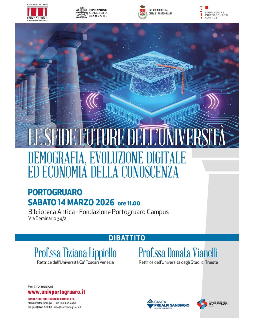 Sabato 14 marzo 2026 alle ore 11.00 la Biblioteca Antica della Fondazione Portogruaro Campus (Via Seminario 34/a) ospiterà l’incontro dal titolo “Le sfide future dell’Università. Demografia, evoluzione digitale ed economia della conoscenza”.
