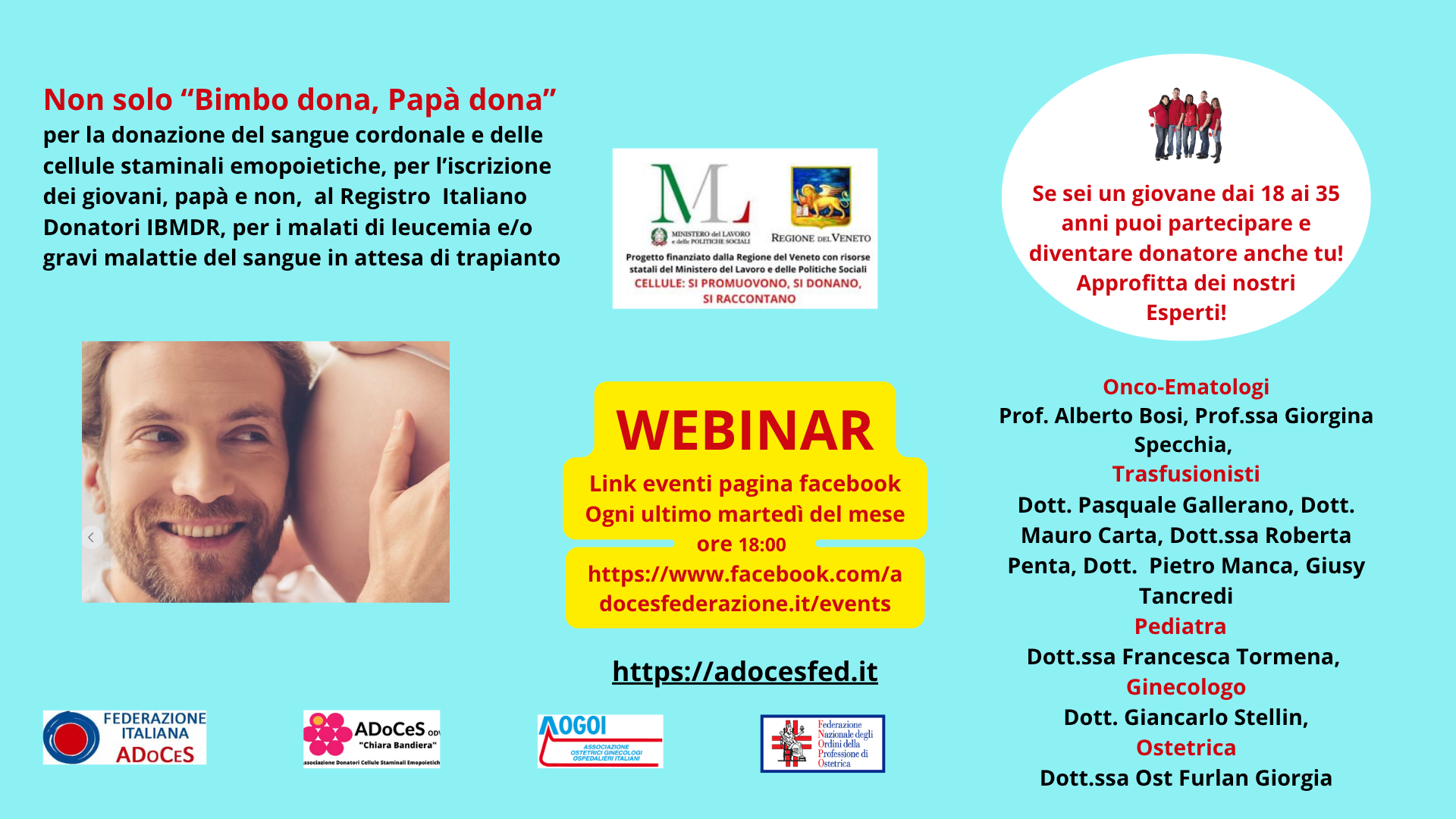 Ogni ultimo martedì del mese, alle ore 18:00, si svolge in diretta sulla pagina Facebook della Federazione Italiana ADoCeS un webinar dedicato alla donazione del sangue cordonale e delle cellule staminali emopoietiche. L'iniziativa rientra nel progetto "Cellule: si promuovono, si donano, si raccontano", finanziato dalla Regione del Veneto con risorse statali del Ministero del Lavoro e delle Politiche Sociali.