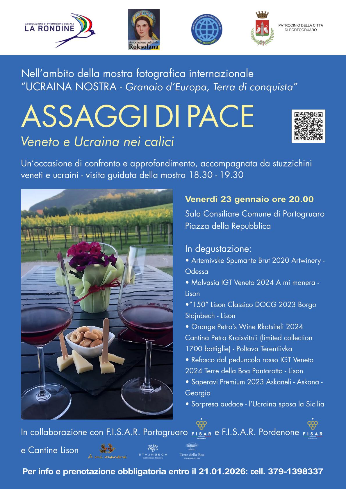 Nell’ambito della mostra fotografica internazionale “Ucraina Nostra – Granaio d’Europa, Terra di conquista”, in corso a Portogruaro, è in programma l’iniziativa “Assaggi di Pace – Veneto e Ucraina nei calici”.