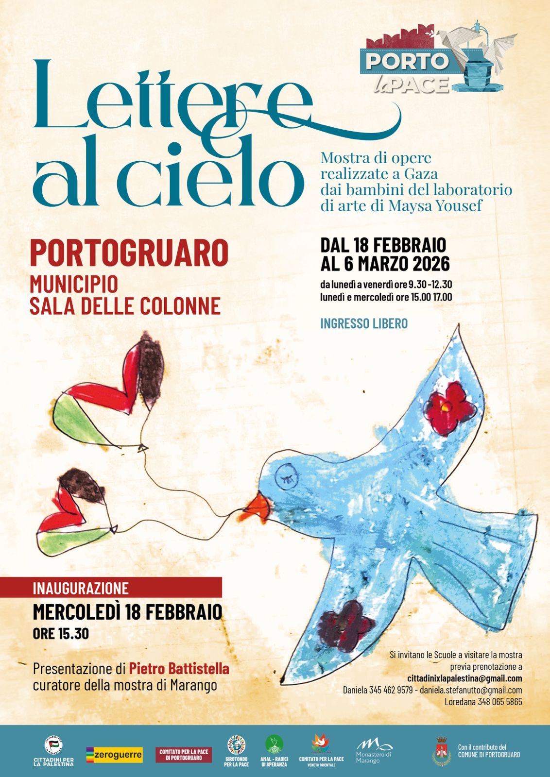 Dal 18 febbraio al 6 marzo 2026 la Sala delle Colonne del Municipio ospita la mostra “Lettere al cielo”, esposizione di opere realizzate dai bambini palestinesi nel laboratorio d’arte dell’artista Maysa Yousef.