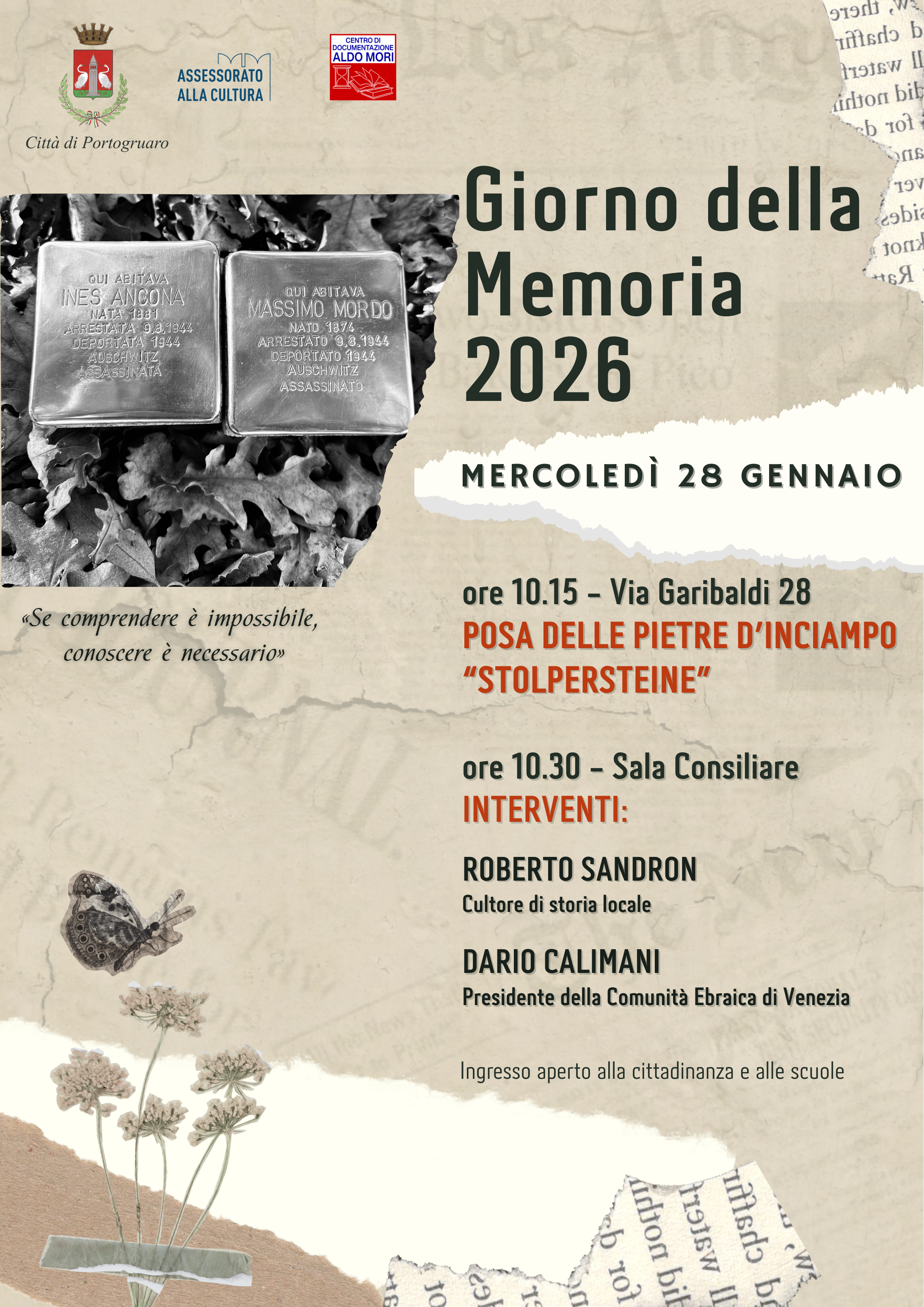 Mercoledì 28 gennaio 2026 la Città di Portogruaro celebra il Giorno della Memoria con una mattinata di iniziative dedicate al ricordo delle vittime della Shoah.
